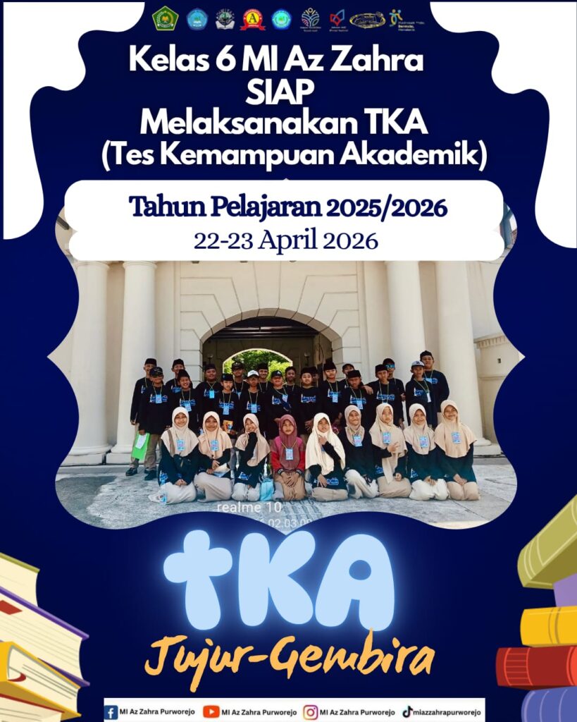 Madrasah Ibtidaiyah (MI) Az Zahra akan melaksanakan Asesmen Sumatif Akhir Tahun (ASAT) bagi siswa kelas VI pada tanggal 6–10 April 2026. Kegiatan ini merupakan bagian penting dalam mengukur capaian hasil belajar siswa selama menempuh pendidikan di jenjang madrasah ibtidaiyah.Berbagai persiapan telah dilakukan oleh pihak madrasah, mulai dari penyiapan ruang ujian, administrasi, hingga koordinasi dengan panitia dan pengawas. Siswa juga diimbau untuk mempersiapkan diri dengan baik, menjaga kesehatan, serta meningkatkan semangat belajar agar dapat mengikuti asesmen dengan optimal.Melalui pelaksanaan ASAT ini, diharapkan seluruh siswa kelas VI MI Az Zahra dapat memperoleh hasil yang maksimal dan siap melanjutkan pendidikan ke jenjang berikutnya.